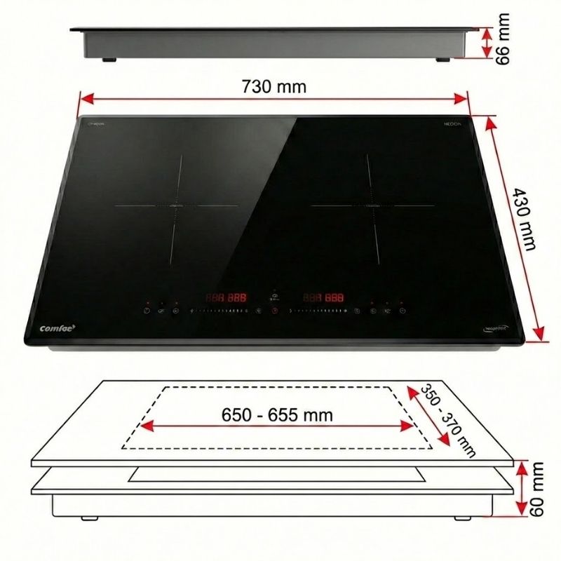 - Mâm từ lõi kép hiệu suất cao: Comfee CIH-40DHE được trang bị mâm từ lõi kép cao cấp, giúp tăng khả năng truyền nhiệt, làm nóng nhanh và phân bổ nhiệt đều hơn. Hệ thống 8 thanh định hướng từ bên dưới mâm từ giúp tập trung từ tính chính xác vào đáy nồi, giảm thất thoát nhiệt và hạn chế ảnh hưởng từ trường đến bo mạch.