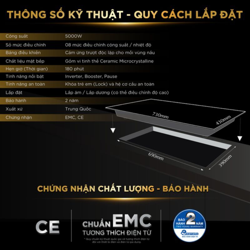 An toàn vượt trội – An tâm khi sử dụng: Bếp được trang bị hệ thống tự động ngắt khi quá nhiệt hoặc nước tràn, giúp bảo vệ linh kiện, kéo dài tuổi thọ sản phẩm và ngăn ngừa nguy cơ cháy nổ. Sản phẩm tuân thủ tiêu chuẩn EMC và đạt chứng nhận CE châu Âu, đảm bảo an toàn điện từ, không gây nhiễu các thiết bị điện khác, vận hành ổn định và bền bỉ.