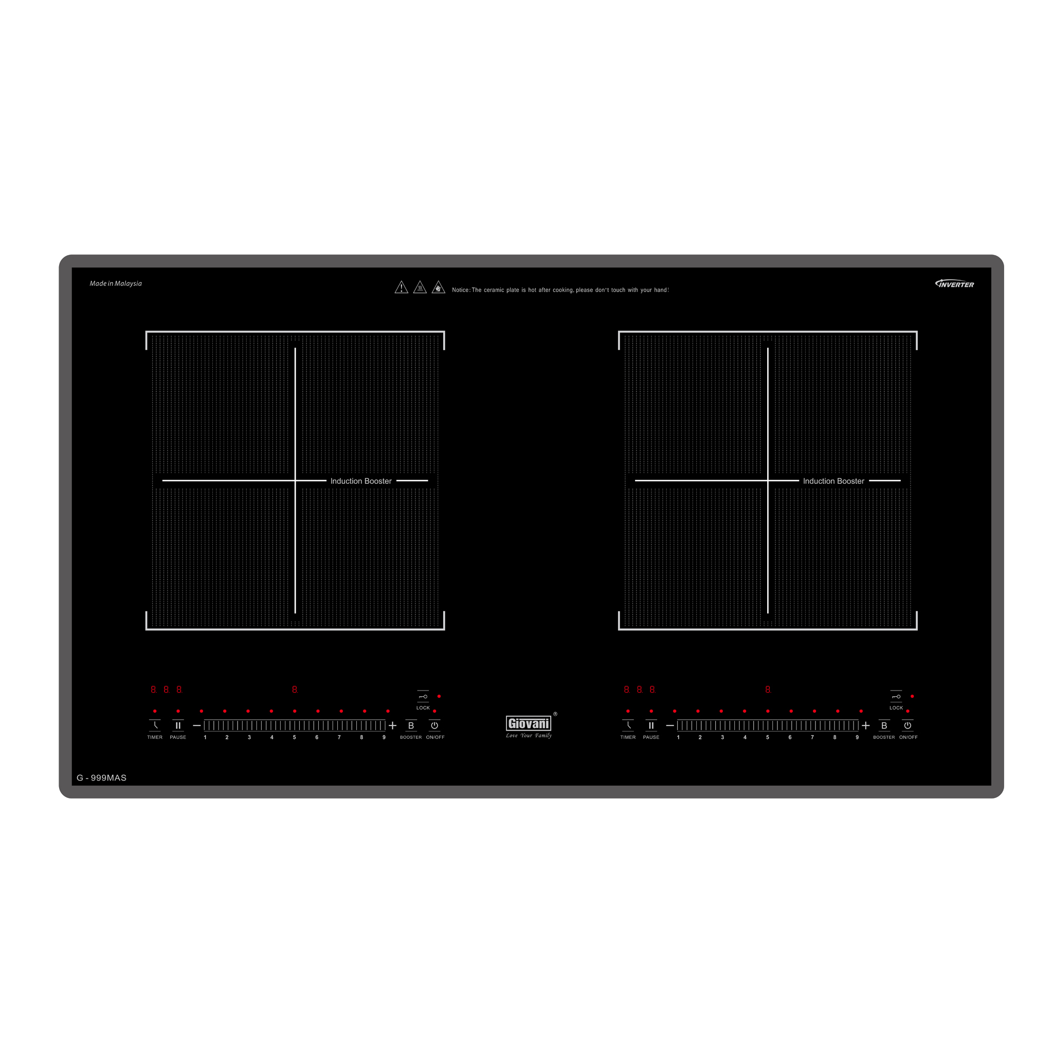 Bếp từ đôi Giovani G-999 MAS là mẫu bếp hiện đại với thiết kế sang trọng, mặt kính Ceramic vát 4 cạnh kết hợp viền hợp kim nhôm cao cấp. Sản phẩm sử dụng linh kiện Siemens và công nghệ Inverter giúp tối ưu hiệu suất nấu nướng, tiết kiệm điện năng và nâng cao độ bền.