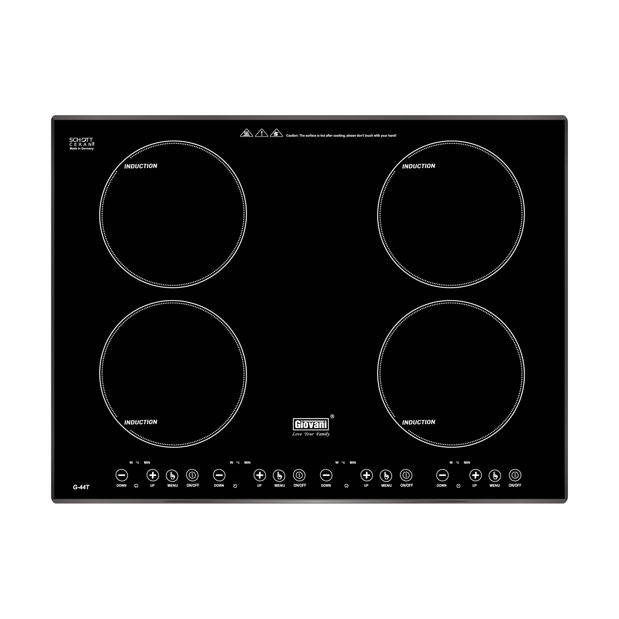 Bếp từ Giovani G-44T là dòng bếp 4 vùng nấu hiện đại, đáp ứng nhu cầu nấu nướng lớn với khả năng hoạt động đồng thời nhiều bếp. Sản phẩm sử dụng mặt kính SCHOTT CERAN Made in Germany cao cấp, bền bỉ và chịu nhiệt tốt, phù hợp với không gian bếp gia đình đông người hoặc sử dụng thường xuyên.