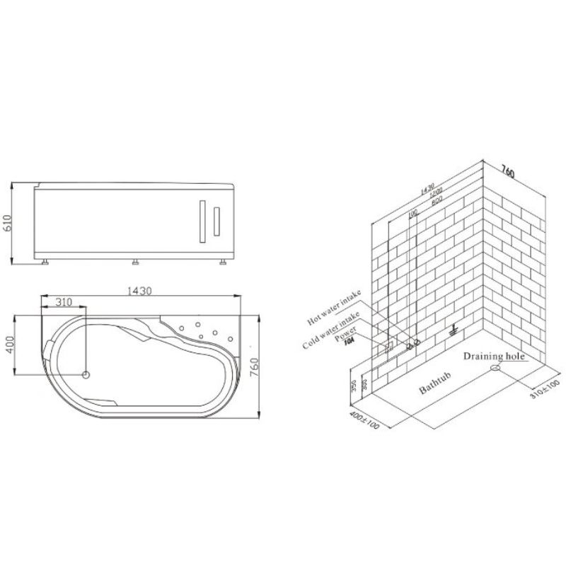 - Kích thước bồn tắm là 1.430*760*610 mm nhỏ gọn phù hợp dành cho 1 người dùng. Thiết kế không chiếm quá nhiều diện tích nhưng vẫn mang lại cho người dùng không gian ngâm mình thoải mái nhất.