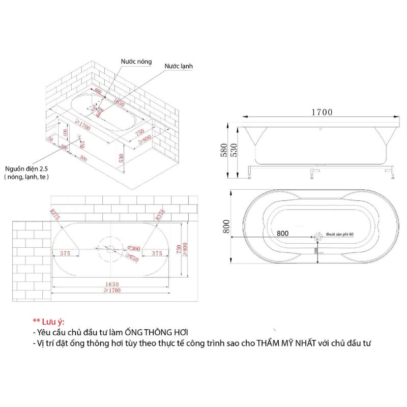 - Kích thước của bồn tắm NG-1707D là 1.700*800*600 mm, nhỏ gọn nhưng không gian tương đối rộng rãi và thoải mái dành cho 1 người sử dụng.