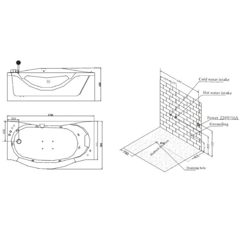 - Bồn tắm massage NG-1792D là bồn tắm hình chữ nhật với kích thước 1700*900*680 mm. Thiết kế 1 mặt áp tường, trang bị 3 bửng bao xung quanh bồn tắm.