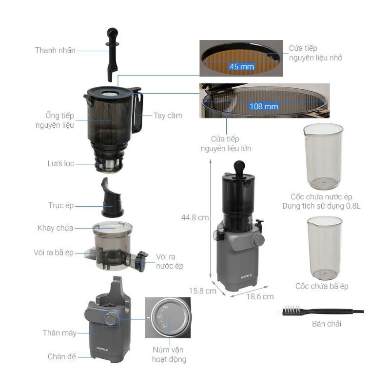 Dễ tháo lắp & vệ sinh: Các bộ phận có thể tháo nhanh, thuận tiện cho vệ sinh sau khi ép