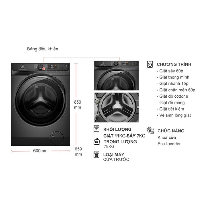 - Khối lượng giặt 11kg – sấy 7kg: Phù hợp gia đình từ 4–6 người.