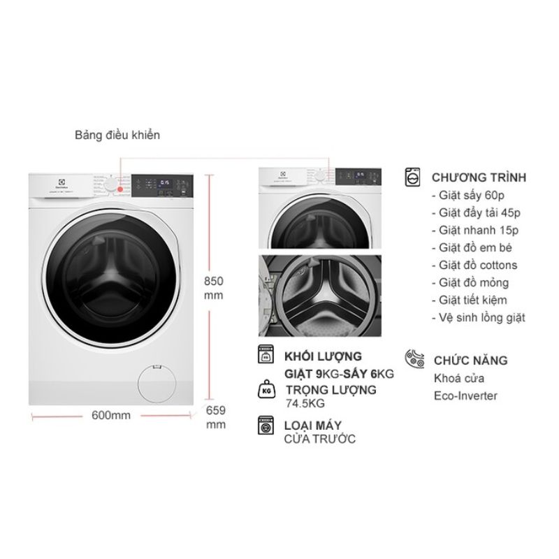 - Khối lượng giặt 9kg – sấy 6kg: Phù hợp cho gia đình từ 3–5 người.