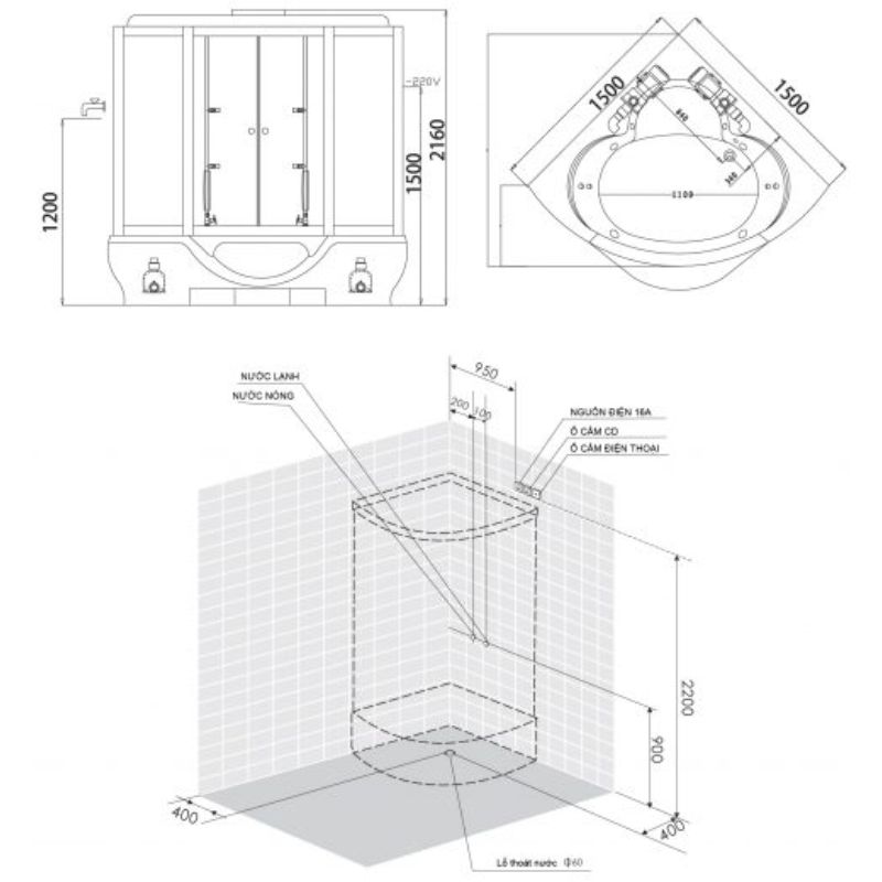 - Kích thước 1500*1500*2160 mm mang đến khoảng không gian rộng rãi và thoải mái, có để cùng lúc từ 2 đến 3 người cho 1 lần sử dụng.