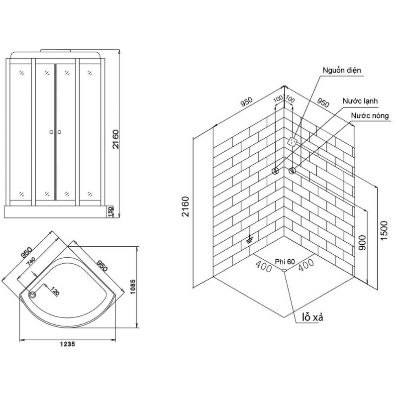 - Kích thước của phòng là 950*950*2160 mm, không gian khá rộng rãi và thoải mái cho 1 người sử dụng.