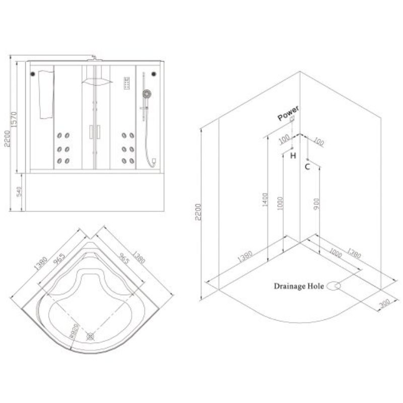 - Kích thước khoảng 1380*1380*2200mm phù hợp cho diện tích phòng tắm nhỏ và sử dụng cho một người.