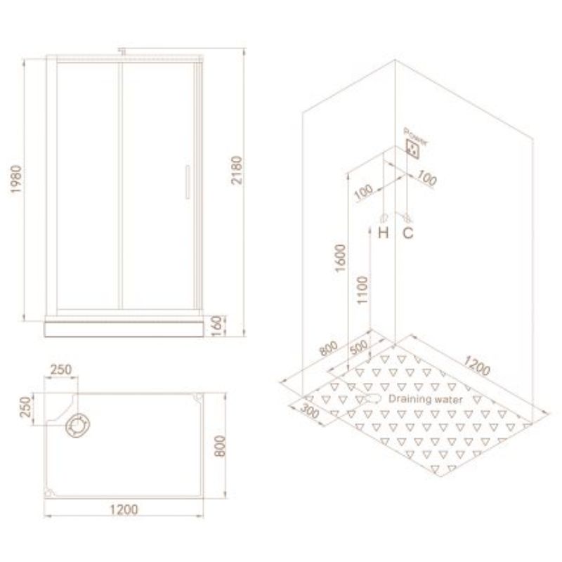 - Kích thước khoảng 1200*800*2180mm phù hợp cho diện tích phòng tắm nhỏ và sử dụng cho một người.