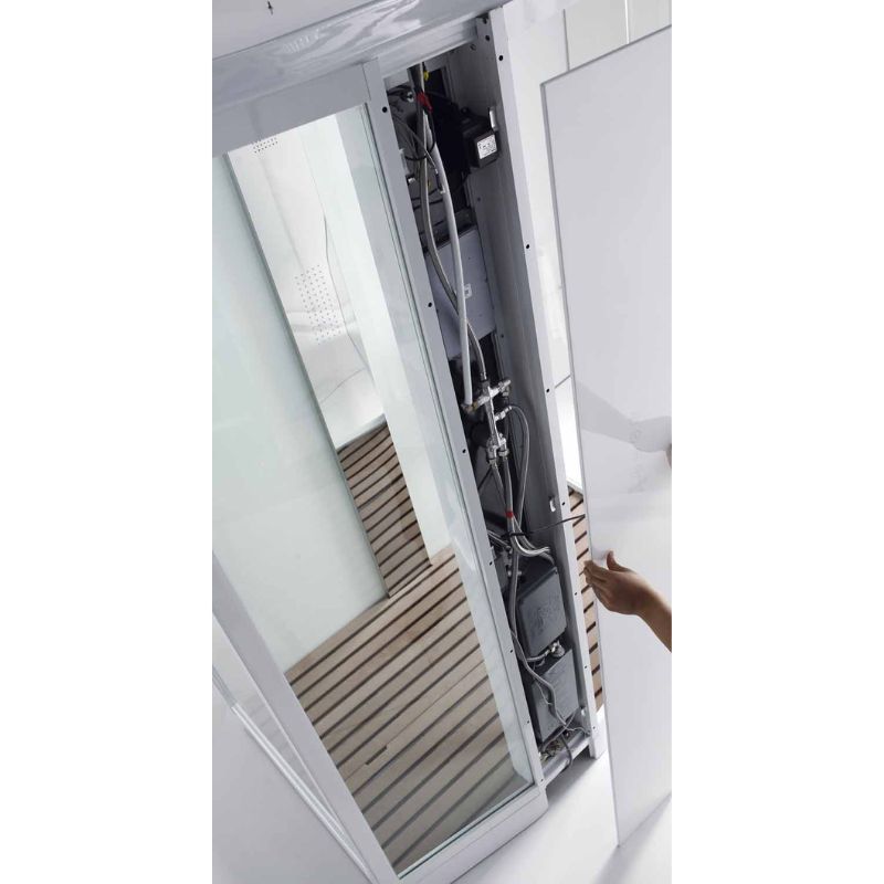 - Bộ khung được làm bằng chất liệu nhôm không gỉ sét. Khung nẹp nhôm nhẹ được cố định các góc cạnh của phòng xông hơi, giữ lớp kính cường lực chắc chắn. Bên cạnh đó, với khung nhôm và phần kính sử dụng, hơi xông không bị thoát ra ngoài, cách điện, cách âm. Cửa phòng dạng kéo với tay cầm chắc chắn được sơn phủ lớp chống ăn mòn.