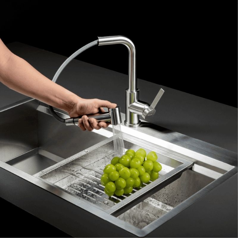 Dây rút linh hoạt: Đầu vòi có thể kéo dài để lấy nước ở nhiều vị trí và vệ sinh các góc chậu thuận tiện hơn.